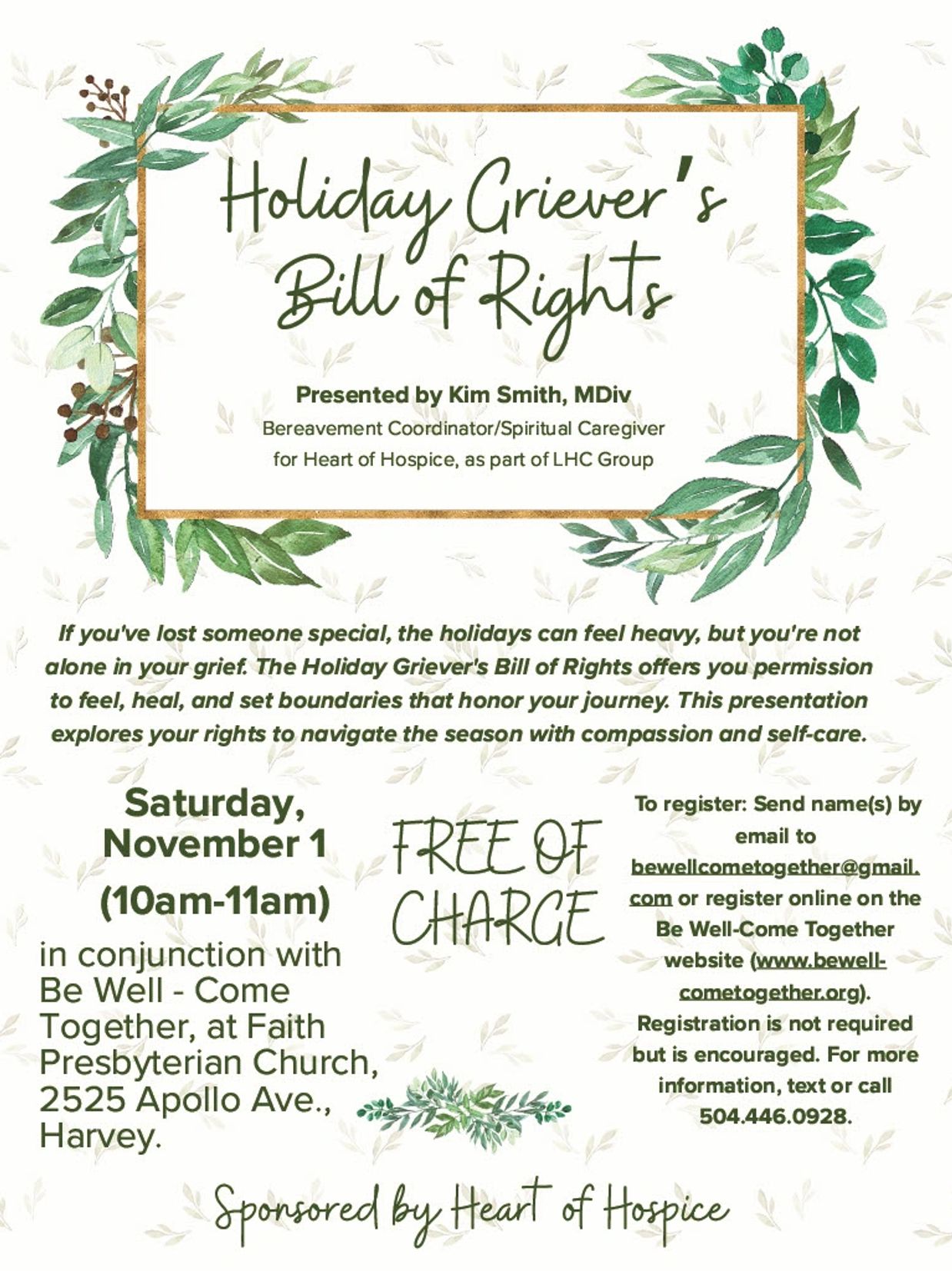A Griever's Bill of Rights", is a free, 1 hour workshop taking place on Saturday, November 1st at 10am at 2525 Apollo Ave., Harvey, LA (inside Faith Presbyterian Church). Register here!